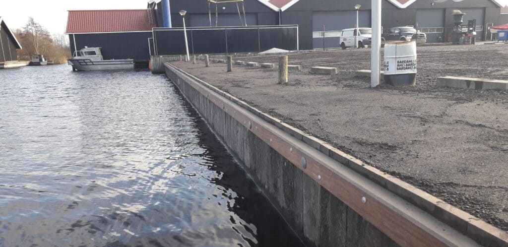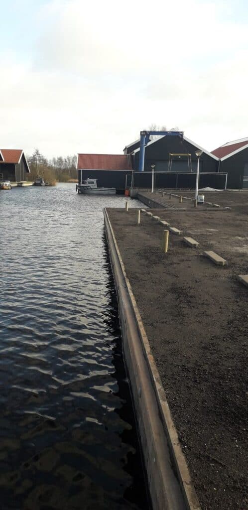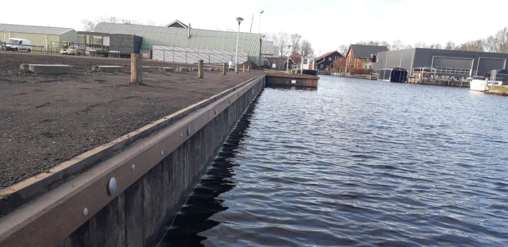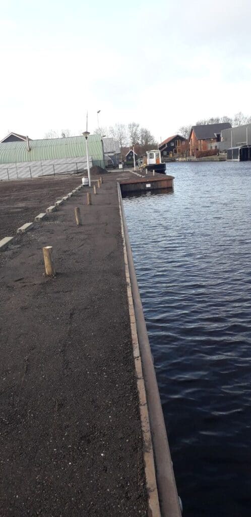 60 m1 hardhouten Walbeschoeiing geplaatst in Earnewoude incl. hardhouten aanlegpalen. In het kader van duurzaamheid en kostenbesparing hebben we gebruikt damwandhout op de kop geplaatst.